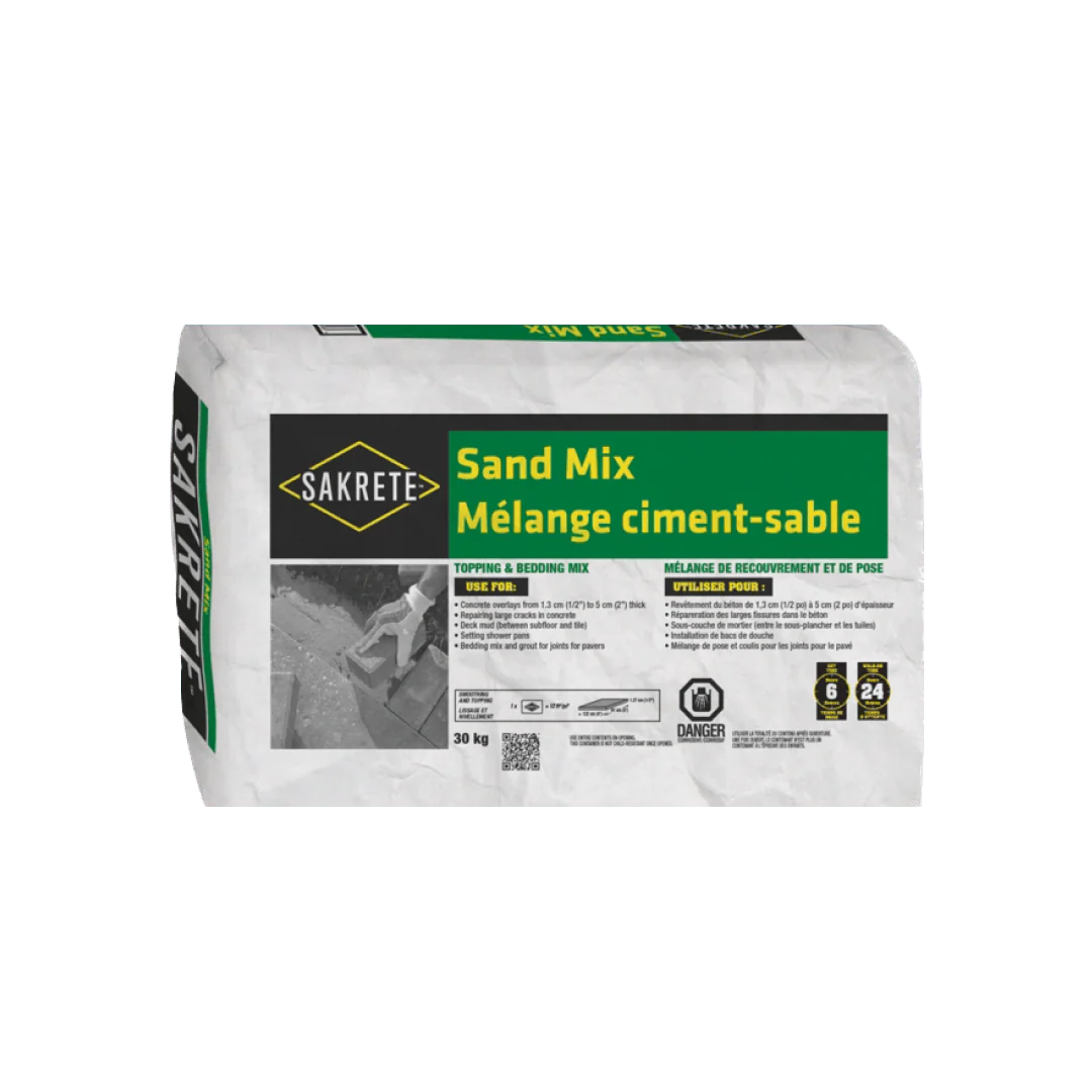 SAKRETE Sand Mix topping and bedding mix is a pre-blended, ready-to-use mixture of Portland cement and well-graded, natural sand. It is designed for new concrete construction projects, concrete overlays and repairs where a thickness of 2 inches (5 cm) or less is required. Can be finished smooth by trowel or textured using a broom or brush. Can be opened to foot traffic in 24 hours. Meets or exceeds strength requirements ASTM C 387 strength requirements.